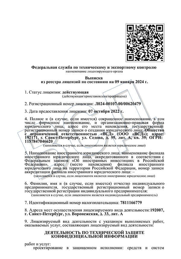 ООО “ВСД” имеет государственную аккредитацию в соответствии с Положением о государственной аккредитации организаций, осуществляющих деятельность в области информационных технологий, утвержденным постановлением Правительства Российской Федерации от 6 ноября 2007г. № 758 “О государственной аккредитации организаций, осуществляющих деятельность в области информационных технологий”.